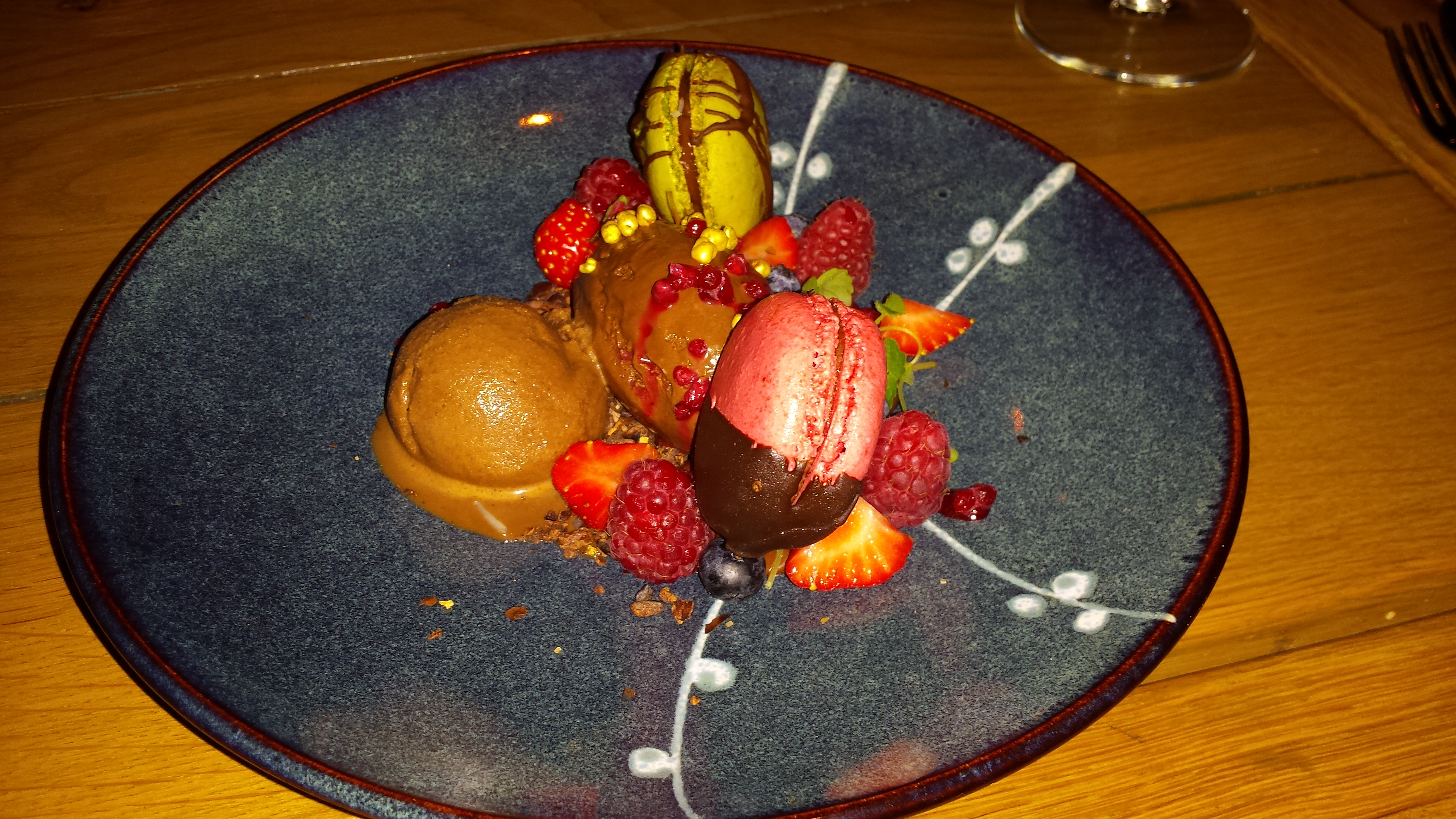 Een dubbele chocolade sorbet met rood fruit en chocolade macarons.