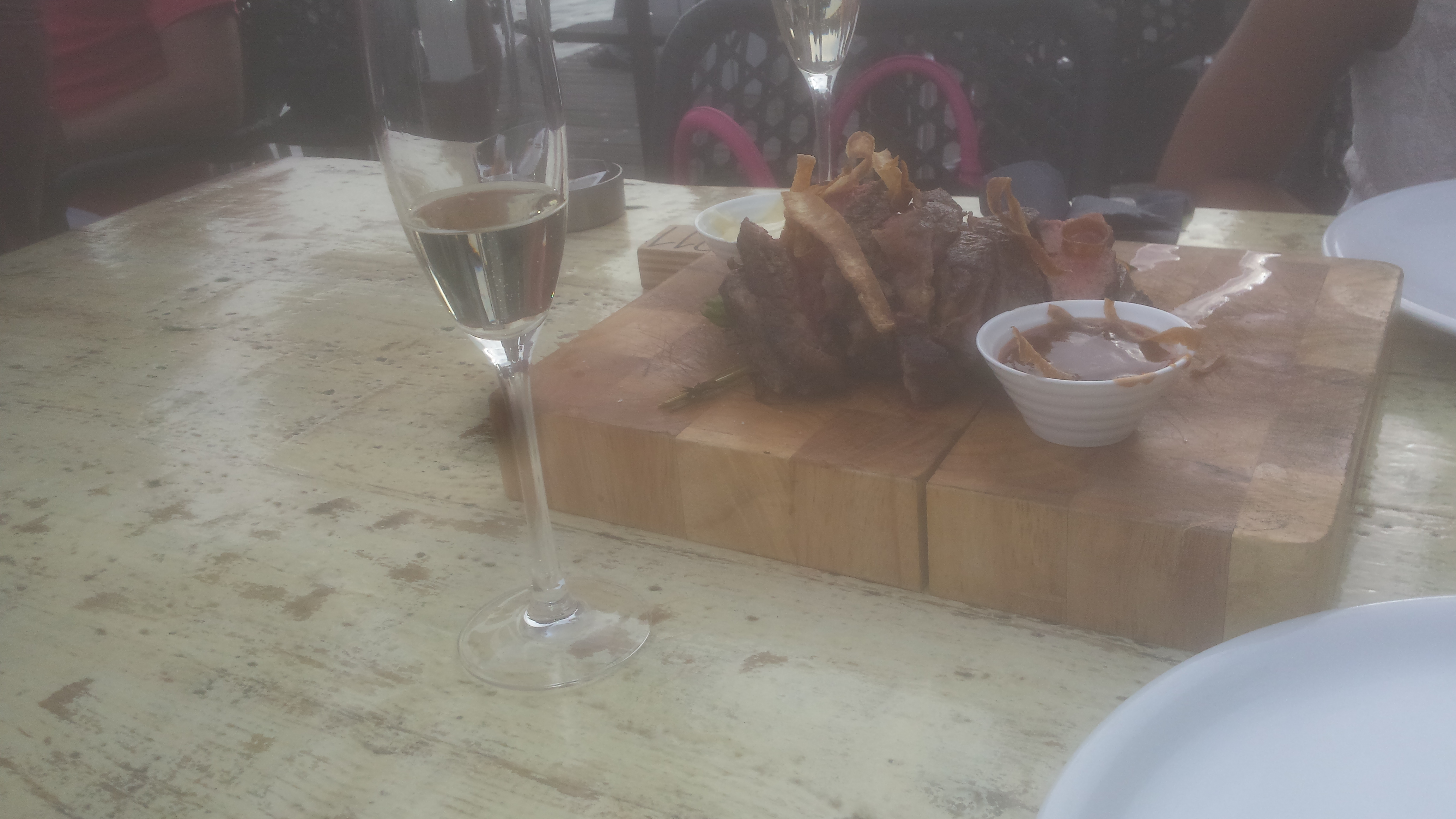 De garing was erg goed, mooi rosé gebraden en de Rib Eye werd getrancheerd (oftewel gesneden) geserveerd op een dikke houten plank met daarop een erg smakelijk garnituur van wortel, bieten en gegrilde aubergine met een passend bbq-achtig sausje.
