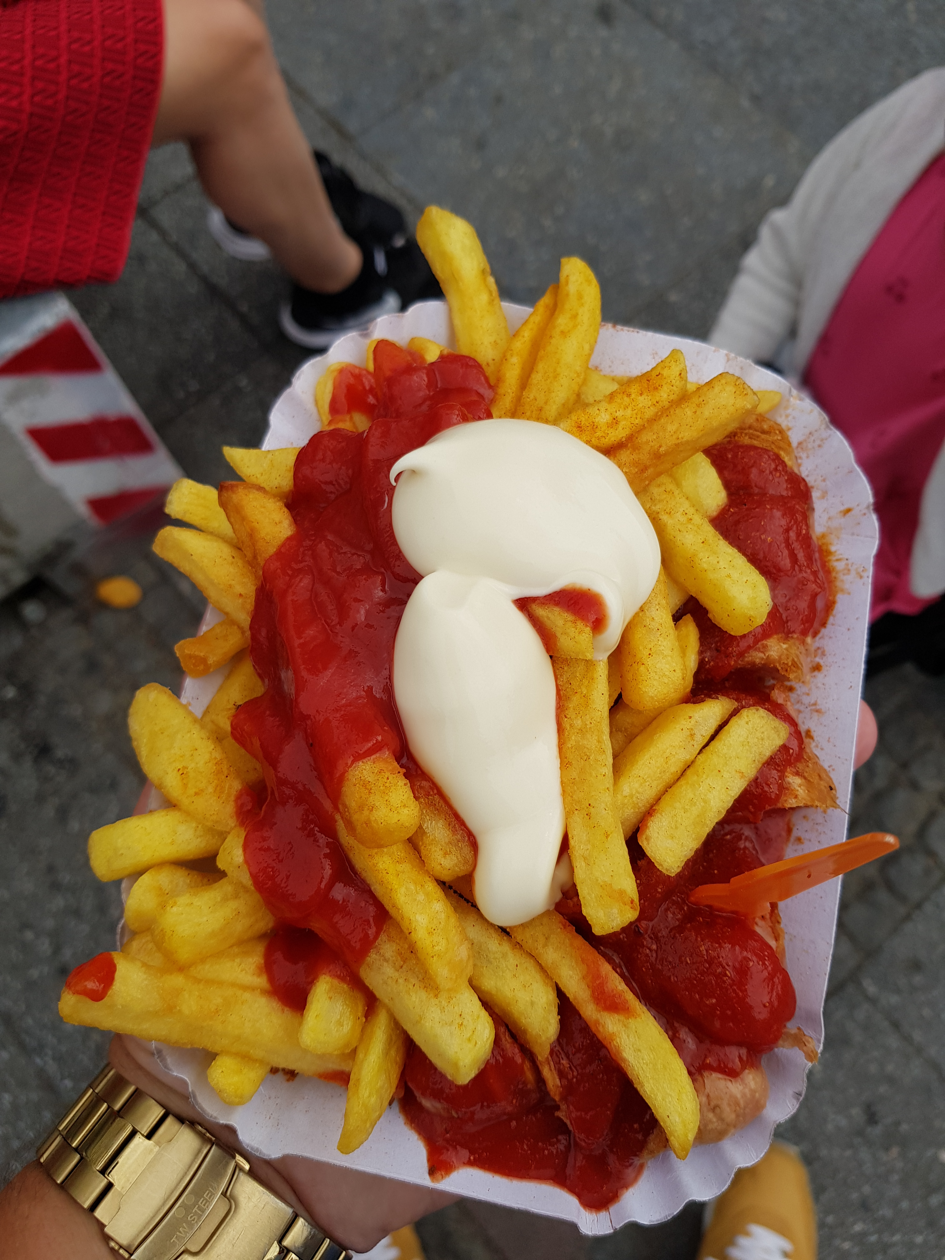 Kosten: voor ongeveer € 4,- eet je een curryworst met patat en saus.