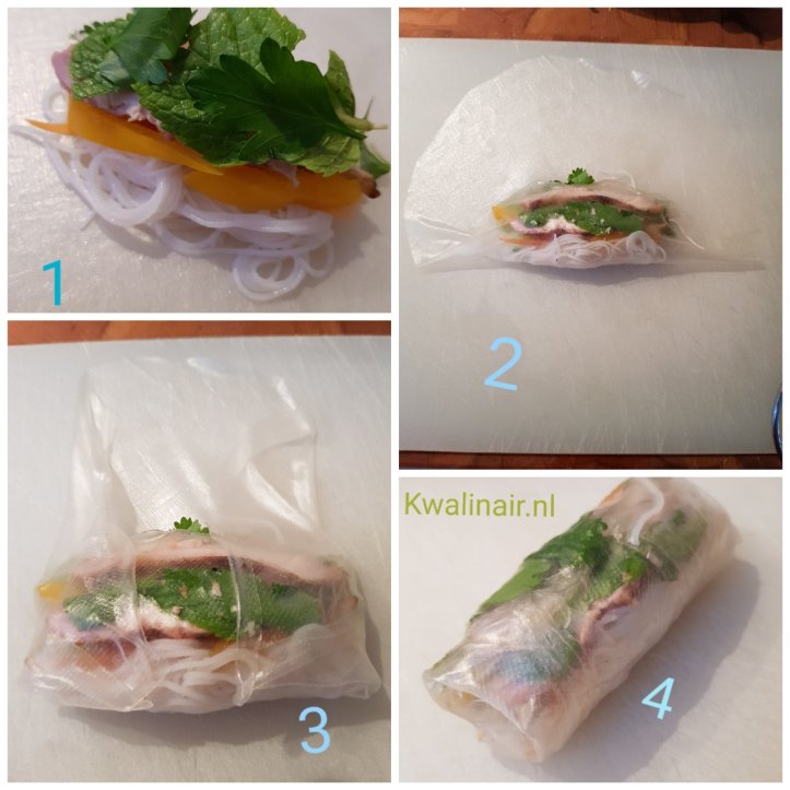 1 Beleg het rijstvel stuk voor stuk met de ingrediënten en bouw dit als laatste op met de ingrediënten die het lastigste blijven liggen. (Ik begin meestal met de noodles en leg daarna het vlees of de garnalen erop en pas daarna de groentes en als laatste de kruiden)