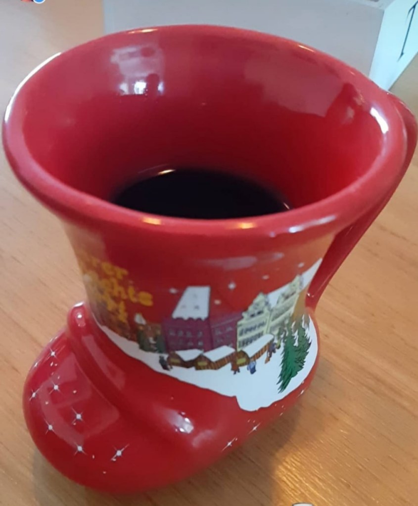 – Breng de wijn richting de kook, maar laat absoluut niet koken. – spoel de zeef even schoon en leg deze op een andere lege pan, lege bak of brede maatbeker en giet hier de glühwein in over. (Zelf giet ik het altijd in een maatbeker omdat je het dan direct netjes in kunt schenken)
