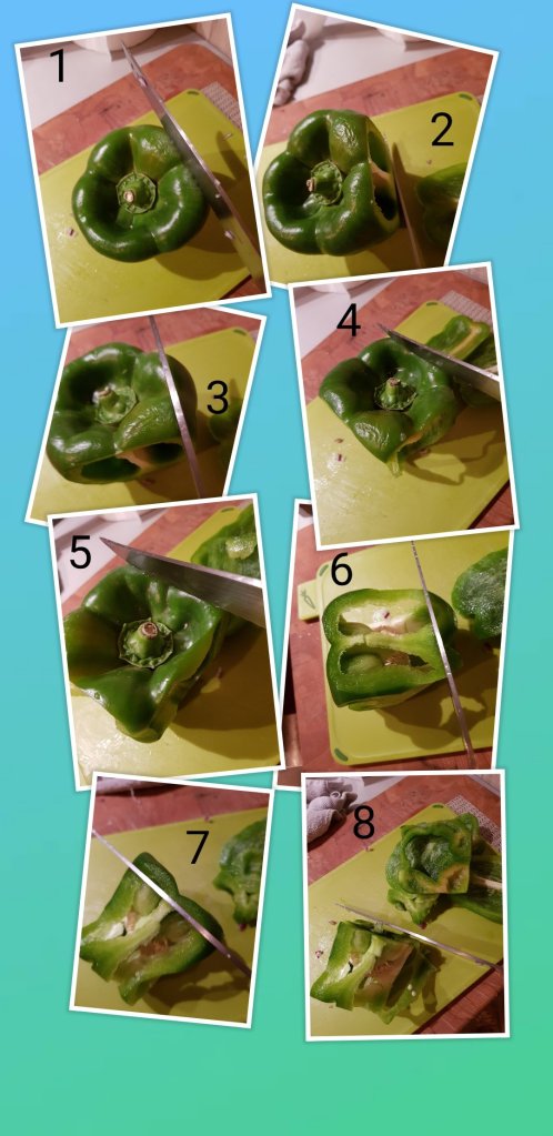 -1 Snijdt aan de bovenkant (steelzijde) van de paprika rondom het dakje er vanaf (begrijp je niet compleet wat ik bedoel kijk dan nog even in de vorige collage met de groene paprika bij nummer 3)