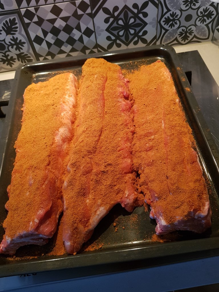 – marineer de ribben een nacht van tevoren door de dry rub hierover te verdelen en smeer/ masseer dit een beetje in het vlees.